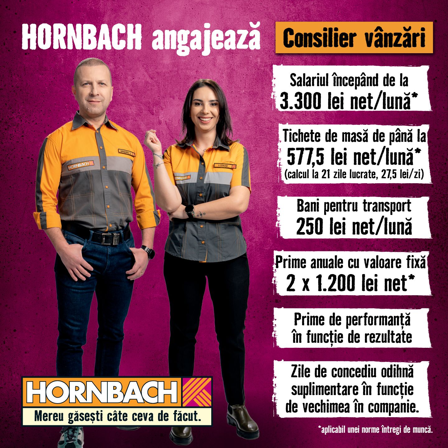 În spatele succesului HORNBACH se află angajaţii noştri, conduşi de către o echipă de management experimentată. Angajații noştri reprezintă succesul companiei. Compania noastră se dezvoltă an de an şi creează astfel permanent locuri de muncă noi şi de durată. Din acest motiv, modalitatea de cooperare este similară celei specifice unei mari familii. Tinerii lucrează alături de cei în vârstă, cei experimentaţi alături de cei în curs de instruire, uniţi prin loialitate, umanitate şi încredere. Dreptul de a greşi este un lucru firesc, asemenea dreptului de a beneficia de perspective profesionale.