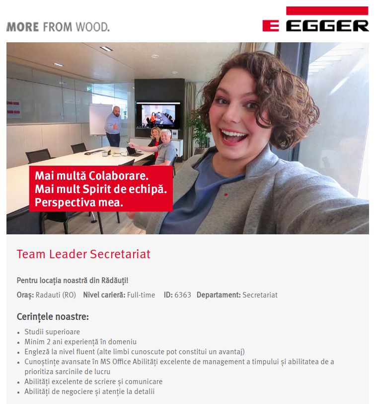 Noi creăm mai mult din lemn. Cei peste 12,000 de angajați ai noștri din întreaga lume lucrează cu entuziasm, împărtășesc valorile familiei noastre și spiritul inovator. Creăm astfel produse pentru mobilier și design interior, construcții si pardoseli laminate. Ne dezvoltăm continuu - fabricam produse noi, ne extindem pe piețe emergente și oferim perspective motivante angajaților noștri.