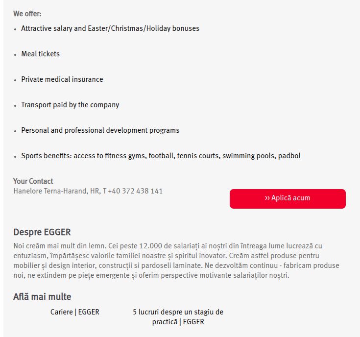 Noi creăm mai mult din lemn. Cei peste 12,000 de angajați ai noștri din întreaga lume lucrează cu entuziasm, împărtășesc valorile familiei noastre și spiritul inovator. Creăm astfel produse pentru mobilier și design interior, construcții si pardoseli laminate. Ne dezvoltăm continuu - fabricam produse noi, ne extindem pe piețe emergente și oferim perspective motivante angajaților noștri.