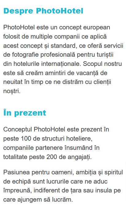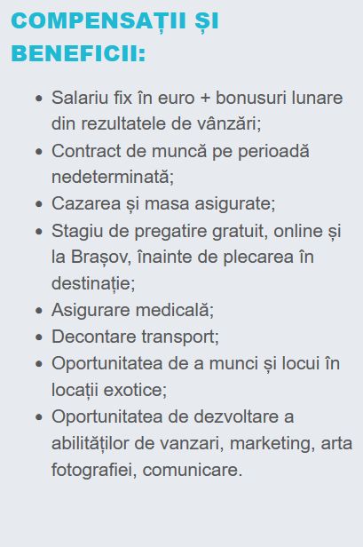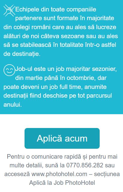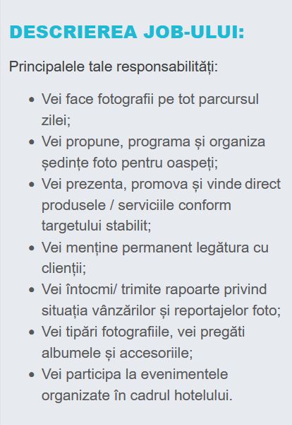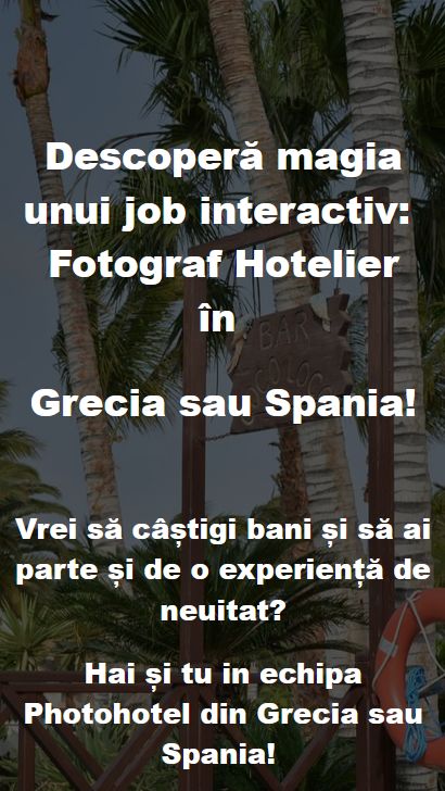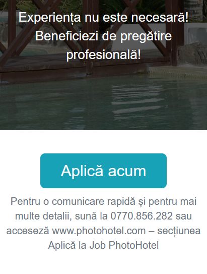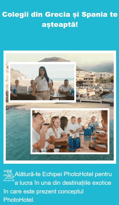 Companiile partenere PhotoHotel ofera angajatilor o oportunitate unica de dezvoltare, atat profesionala, prin tehnici de vanzari, invatarea de limbi straine si dobandirea abilitatilor unui fotograf profesionist, cat si personala prin depasirea multor bariere in comunicare.