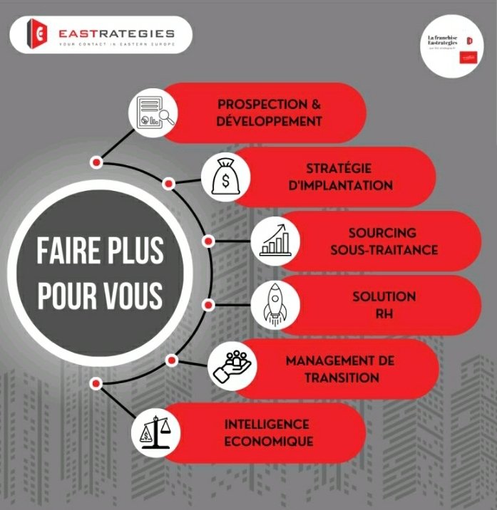 Eastrategies est une société de conseil et d’accompagnement opérationnel spécialisée sur les marchés d’Europe de l’Est (Roumanie, Bulgarie, Moldavie). Nos services : Aide  à l’implantation, recherche de terrains et locaux, création de filiale, prise de participation, recrutement, sous-traitance, conseil en stratégie, prospection commerciale, distribution, portage salarial, représentation commerciale, étude de marché et fusion et acquisition.